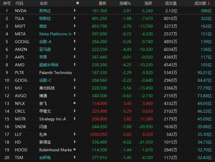 美股成交额前20:英伟达跌近3% 多数基金经理认为人工智能投资热潮已经过头