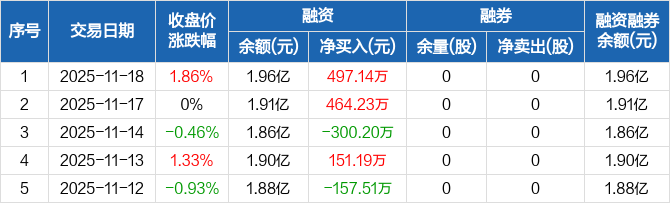 融资方面,当日融资买入1691.54万元,融资偿还1194.4万元,融资净买入497.14万元。融券方面,融券卖出0股,融券偿还0股,融券余量0股,融券余额0元。融资融券余额合计1.96亿元。