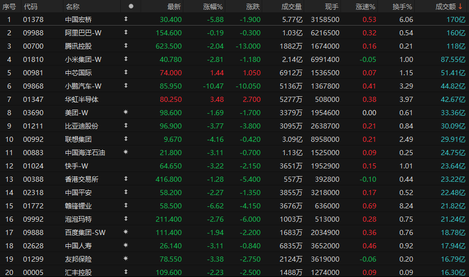 港股成交额前二十