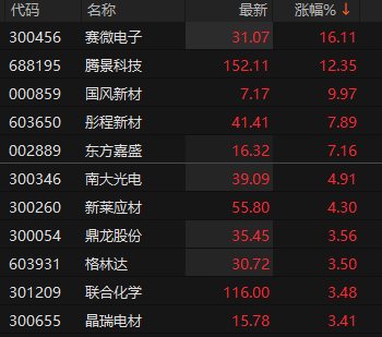 上证报中国证券网讯 11月19日早盘,光刻机概念震荡拉升,截至10时09分,国风新材涨停,赛微电子、腾景科技涨超10%,东方嘉盛、彤程新材、南大光电等跟涨。