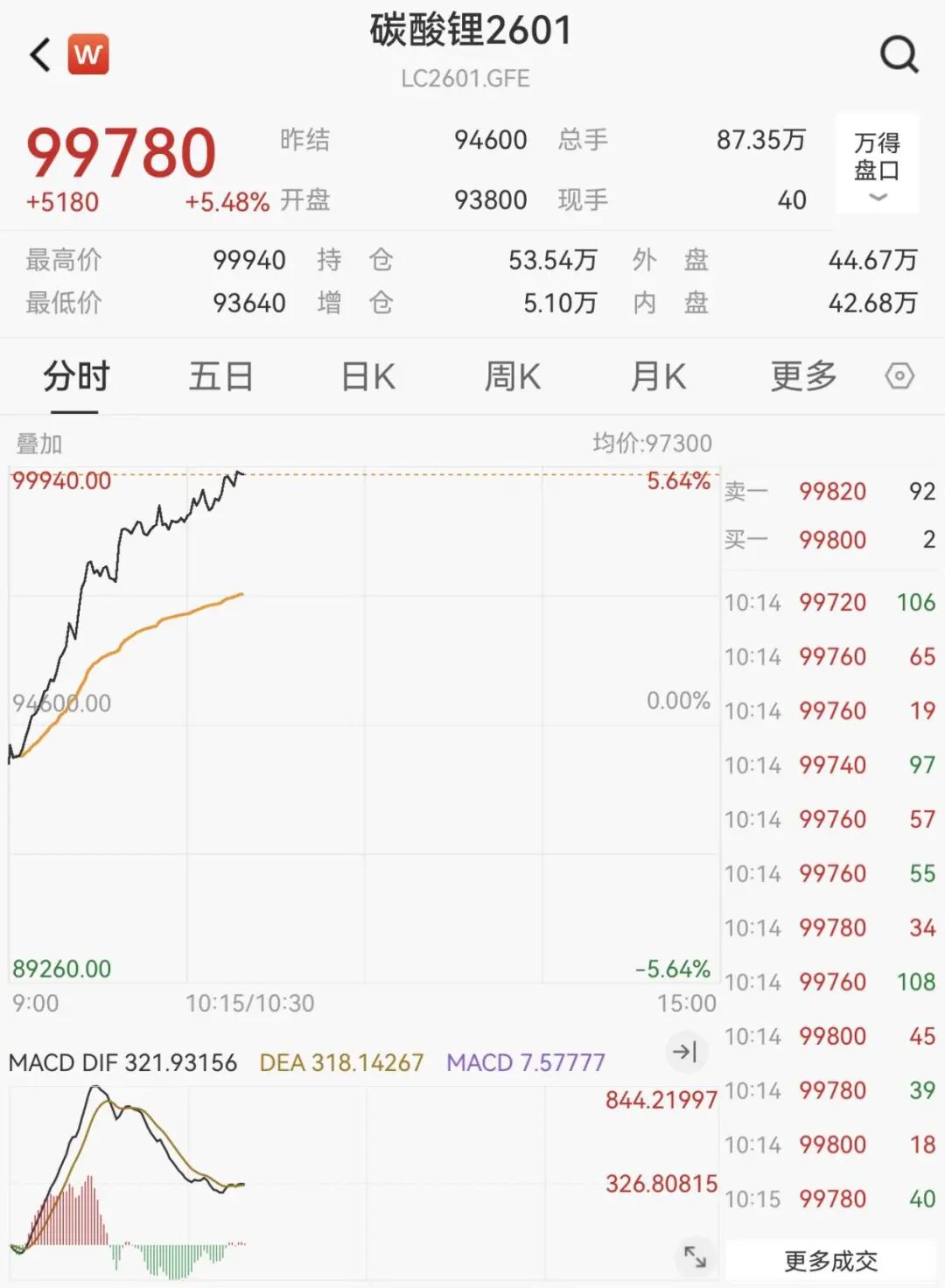 消息面上,碳酸锂期货主力合约日内涨超5%,现报99780元/吨。