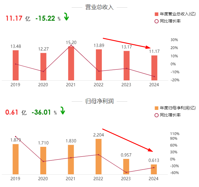 财务数据显示,公司自2021年上市后业绩呈持续下滑态势,2022年至2024年,营业收入从13.89亿元降至11.17亿元,归母净利润更是从2.20亿元缩水至0.61亿元,盈利能力逐年弱化。