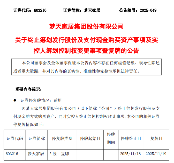 11月18日晚间,梦天家居(603216)的一系列公告打破了资本市场的平静。