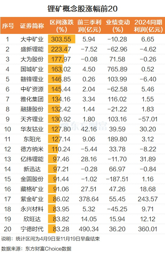 从业绩来看,涨幅前20的锂矿概念中,国城矿业前三季度业绩表现亮眼,赚了4.5亿元,同比大增765.89%。雅化集团、华友钴业、东阳光、藏格矿业、紫金矿业、欣旺达、宁德时代前三季度业绩也明显增长。此外,减亏的、扭亏的也不在少数,比如大为股份、赣锋锂业、天齐锂业等。