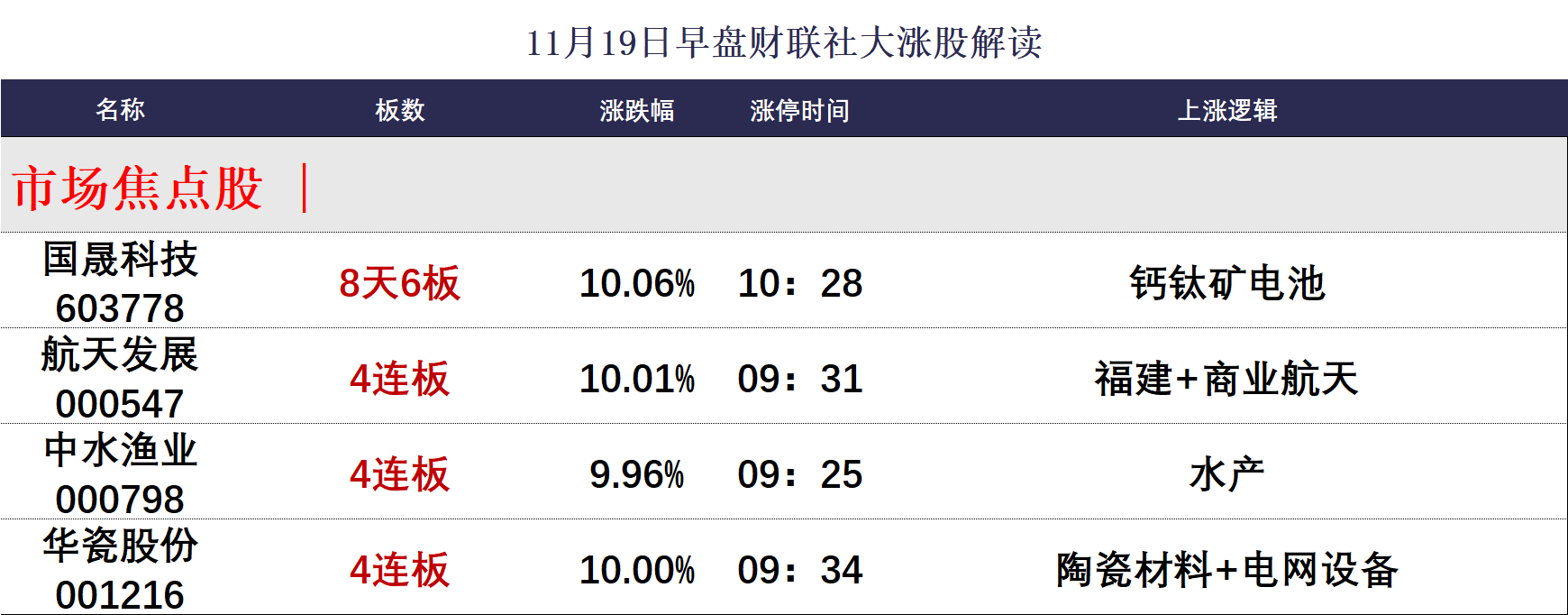 今日午盘全市场共38股涨停,连板股总数13只,17股封板未遂,封板率为69%(不含ST股、退市股)。焦点股方面,钙钛矿电池概念股国晟科技走出8天6板,中水渔业一字涨停晋级4连板,福建本地股航天发展4连板,电网设备股华瓷股份4连板。