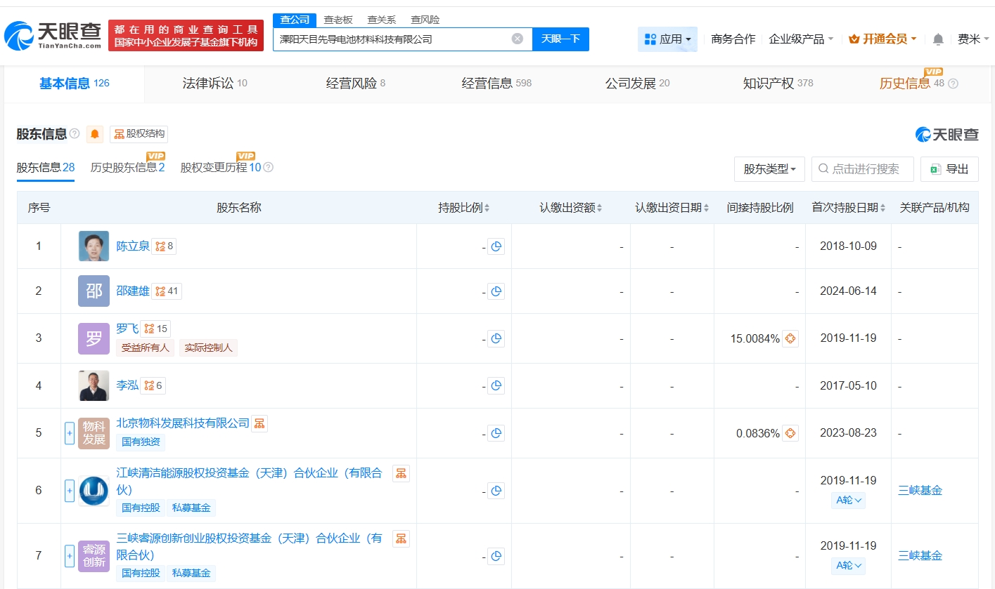 每经AI快讯,天眼查工商信息显示,近日,溧阳天目先导电池材料科技有限公司发生工商变更,原股东苏州海松硬核科技股权投资基金合伙企业(有限合伙)退出,新增宁德时代参投的福建时代泽远股权投资基金合伙企业(有限合伙)、深圳市绿水长青创业投资合伙企业(有限合伙)为股东。溧阳天目先导电池材料科技有限公司成立于2017年5月,注册资本约9.5亿元人民币,法定代表人为罗飞,经营范围包括锂电池负极材料的技术开发、技术转让、技术服务、技术咨询、生产、加工和销售等。股东信息显示,该公司现由陈立泉、邵建雄及上述新增股东等共同持股。