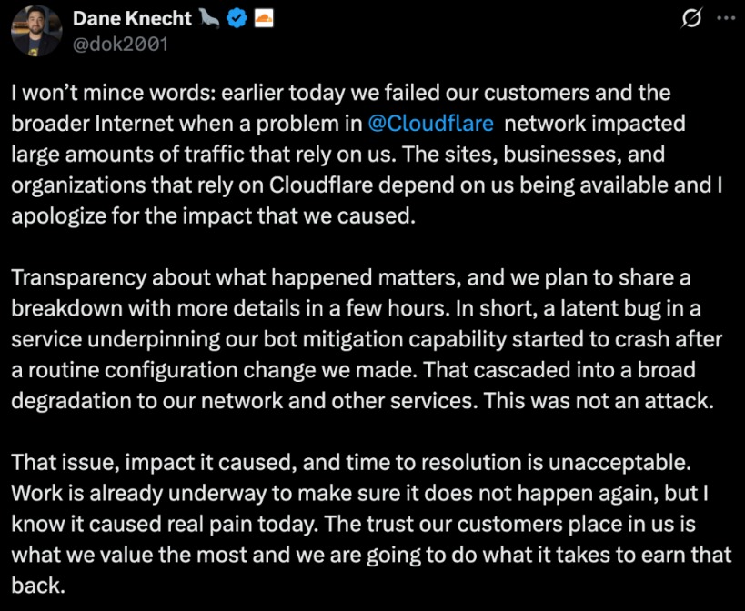 Cloudflare CTO戴恩·克内切特(Dane Knecht)也在社交平台发文,对故障深表歉意,表示此次事故系公司支撑发现僵尸程序缓解功能的某个服务中存在潜在缺陷,在进行常规配置变更后开始崩溃,进而引发网络及其他服务的大范围退化,而非遭受攻击所致。
