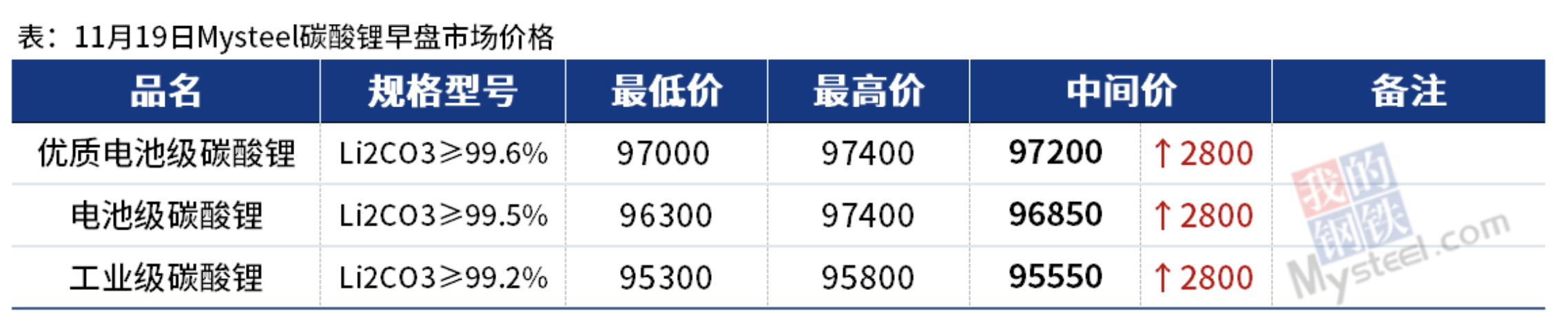 现货市场上,上海钢联11月19日发布数据显示,今日电池级碳酸锂(早盘)价格较昨日上涨2800元/吨,中间价报96850元/吨。