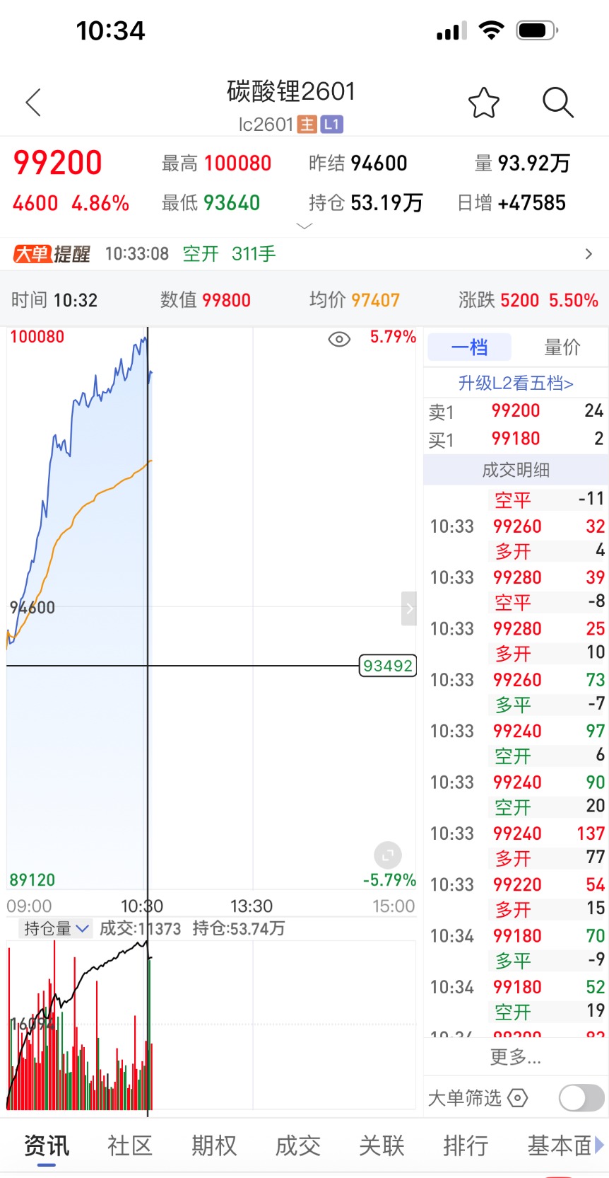期货市场上,碳酸锂2601合约盘中一度大涨5.79%,突破10万元/吨的关口,至此碳酸锂2601合约年内涨幅逾28%。