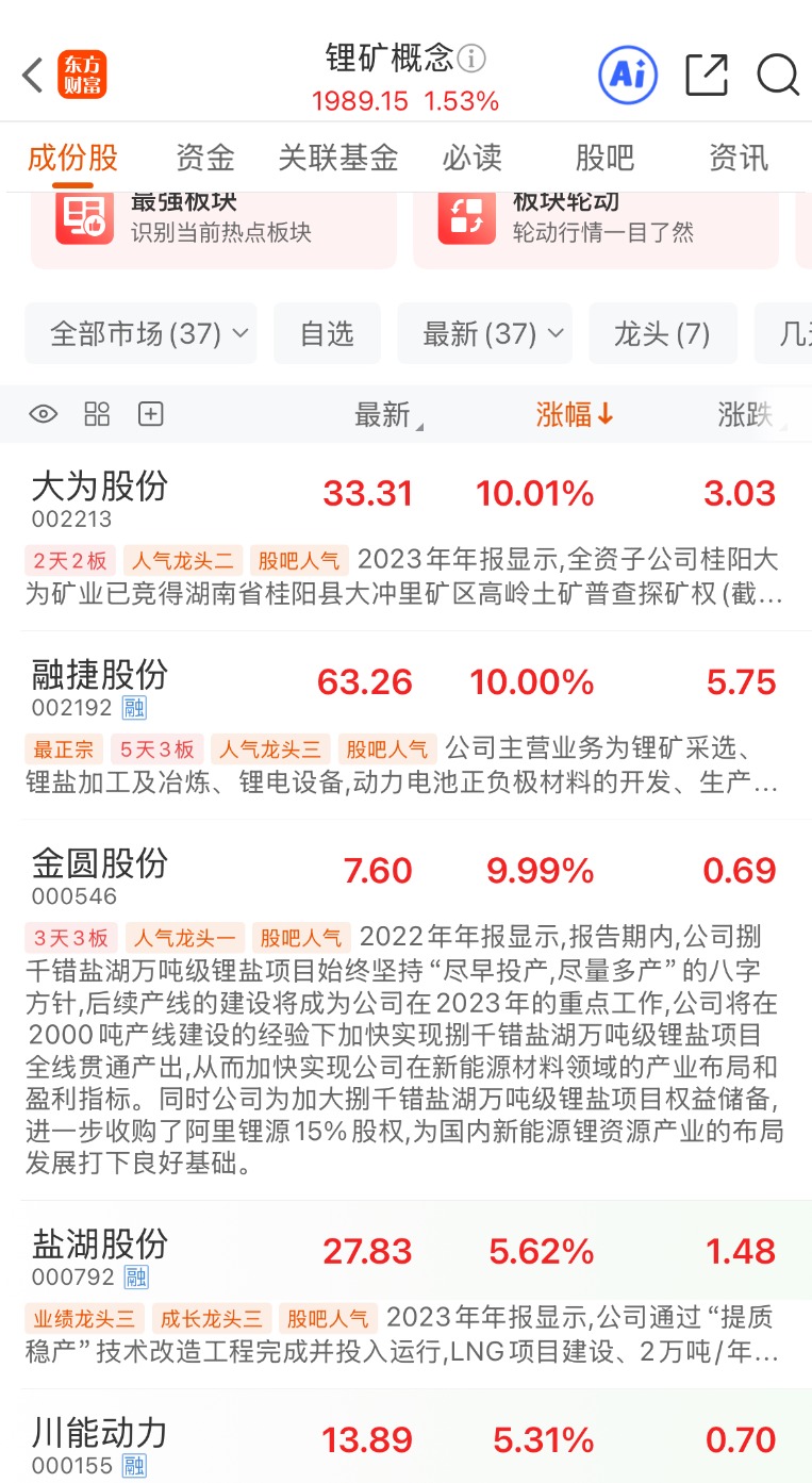与此同时,天齐锂业、川能动力、盐湖股份等多只锂矿概念股跟涨;大中矿业盘中一度涨超5%,年内涨幅达285.22%。