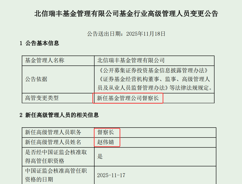 11月18日,北信瑞丰基金同时发布三条高管变更公告,在空缺两年半之后,赵伟婧出任北信瑞丰基金督察长。此外,副总经理王乃力(曾于2023年代任过公司总经理)离任。这是北信瑞丰基金继今年三季度总经理变更后的又一次高管变更。