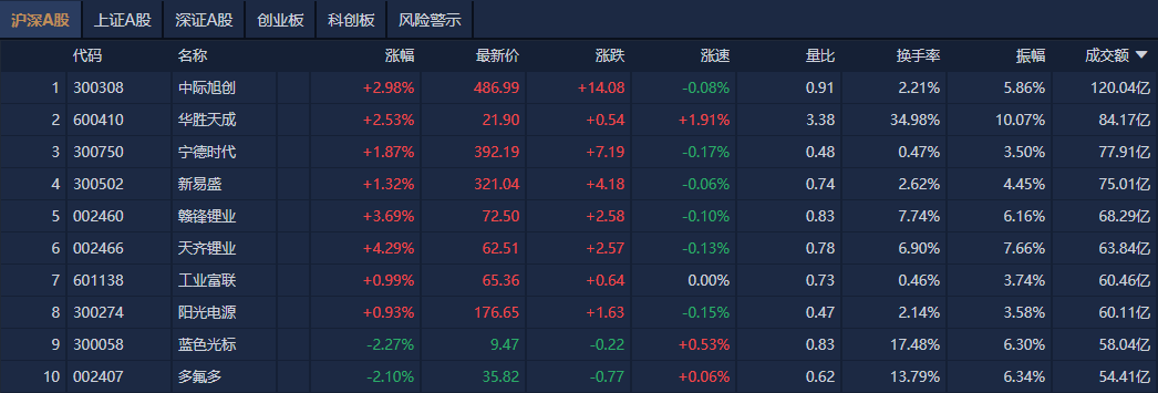 个股方面,中际旭创成交额超120亿元居首,华胜天成、宁德时代、新易盛成交额靠前。