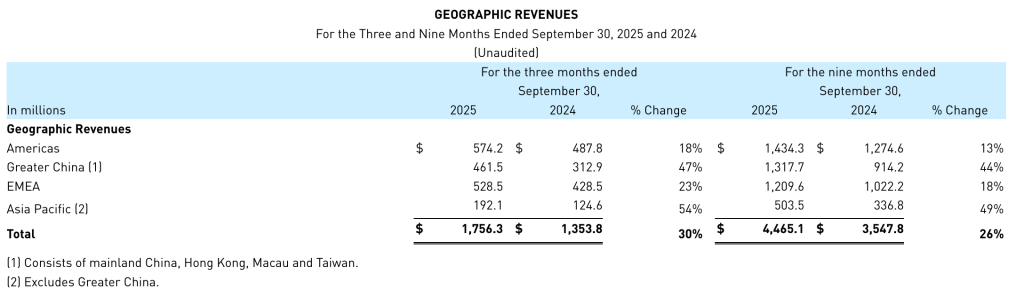 其他市场方面,第三季度亚太地区(不包括中国)营收1.92亿美元,同比增长54%;美洲和欧洲、中东、非洲(EMEA)营收分别为5.74亿美元和5.29亿美元,同比分别增长18%和23%。