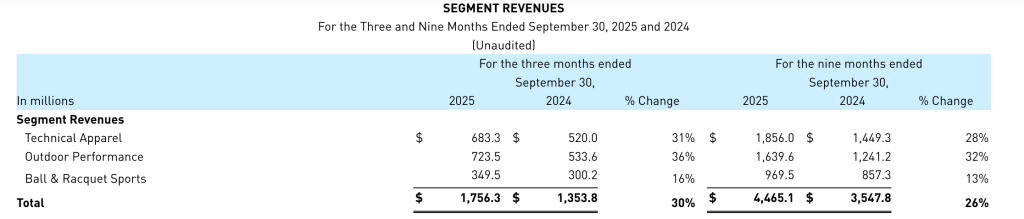 分业务来看,第三季度,户外功能性服饰销售额增长31%至6.83亿美元,调整后营业利润同比增长19.3%。山地户外服饰及装备收入增长36%至7.24亿美元,调整后营业利润同比增长8.6%。