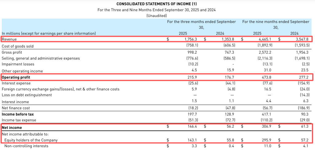 11月18日美股盘前,运动和户外品牌集团亚玛芬体育(NYSE:AS)发布2025年第三季度财务业绩,再创历史新高。财报指出,第三季度营收、调整后利润率和每股收益均超出预期。第三季度亚玛芬集团营收达17.56亿美元,同比增长30%。营业利润为2.16亿美元,同比增长22%。归母净利润为1.43亿美元,同比增长156%,每股收益0.25美元;经调整净利润1.85亿美元,同比增长161%,每股收益0.33美元。毛利率同比上升1.6个百分点至56.8%。