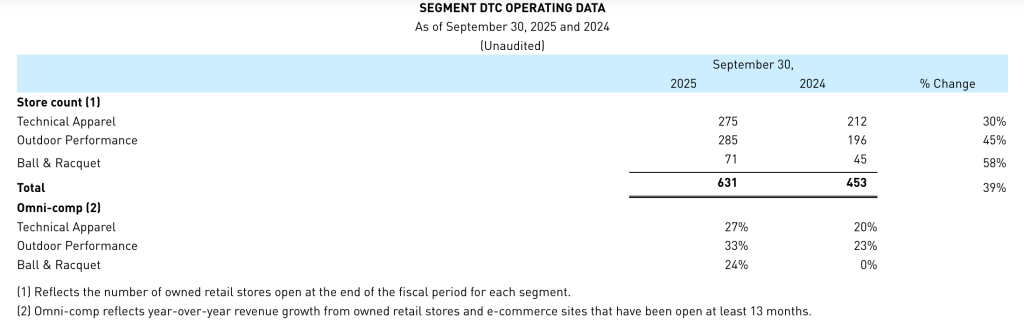 从渠道看,第三季度品牌直营渠道(DTC)销售额同比增长51%,批发渠道同比增长18%。截至三季度末,集团自有门店总数631家,同比增长39%。其中,户外功能性服饰板块自有门店数为275家,同比增长30%;山地户外服饰及装备门店285家,同比增长45%;球类及球拍装备业务门店为71家,同比增长58%。