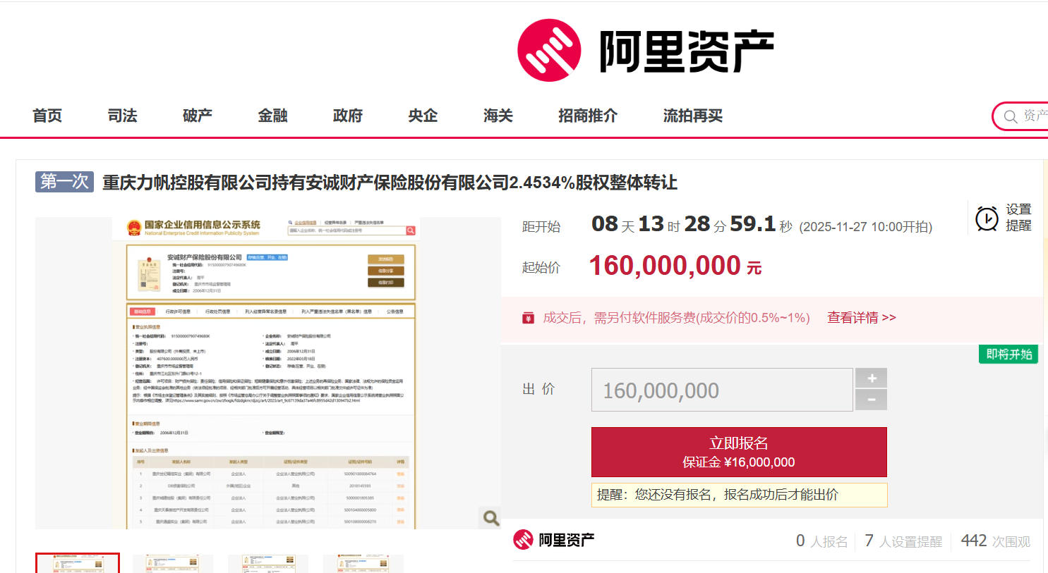 阿里资产平台显示,重庆力帆控股拟将其持有安诚财险2.4534%股权整体转让,起拍价为1.6亿元,开拍时间为11月27日,截至发稿有442次围观,7人设置提醒。