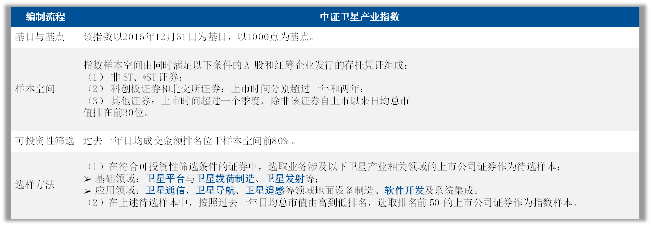 中证卫星产业指数选取 50 只业务涉及卫星制造、卫星发射、卫星通信、卫星导航、卫星遥感等领域的上市公司证券作为指数样本,反映卫星产业上市公司证券的整体表现。从成份股分布看,其全面覆盖产业链各环节,并对卫星应用的暴露更加充分。