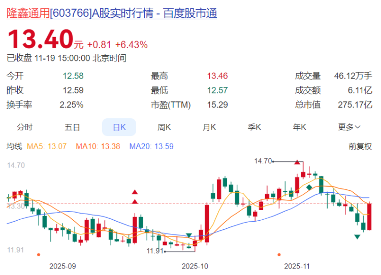 隆鑫通用报收13.40元,日涨幅6.43%,列渝股第一,换手率2.25%,今年以来的涨幅为54.02%。