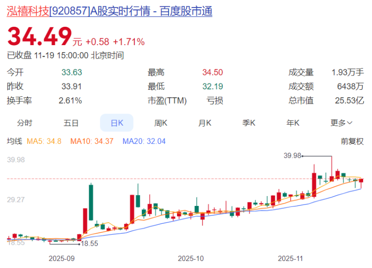 泓禧科技报收34.49元,日涨幅1.71%,列渝股第三,换手率2.61%,今年以来的涨幅为145.31%,仅次于巨人网络190.48%,列渝股第二。