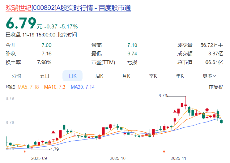 欢瑞世纪报收6.79元,日涨幅-5.17%,换手率7.98%,今年以来的涨幅为108.28%。