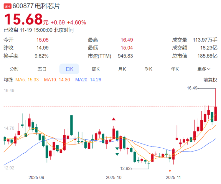电科芯片报收15.68元,日涨幅4.60%,列渝股第二,换手率9.62%,今年以来的涨幅为18.88%。