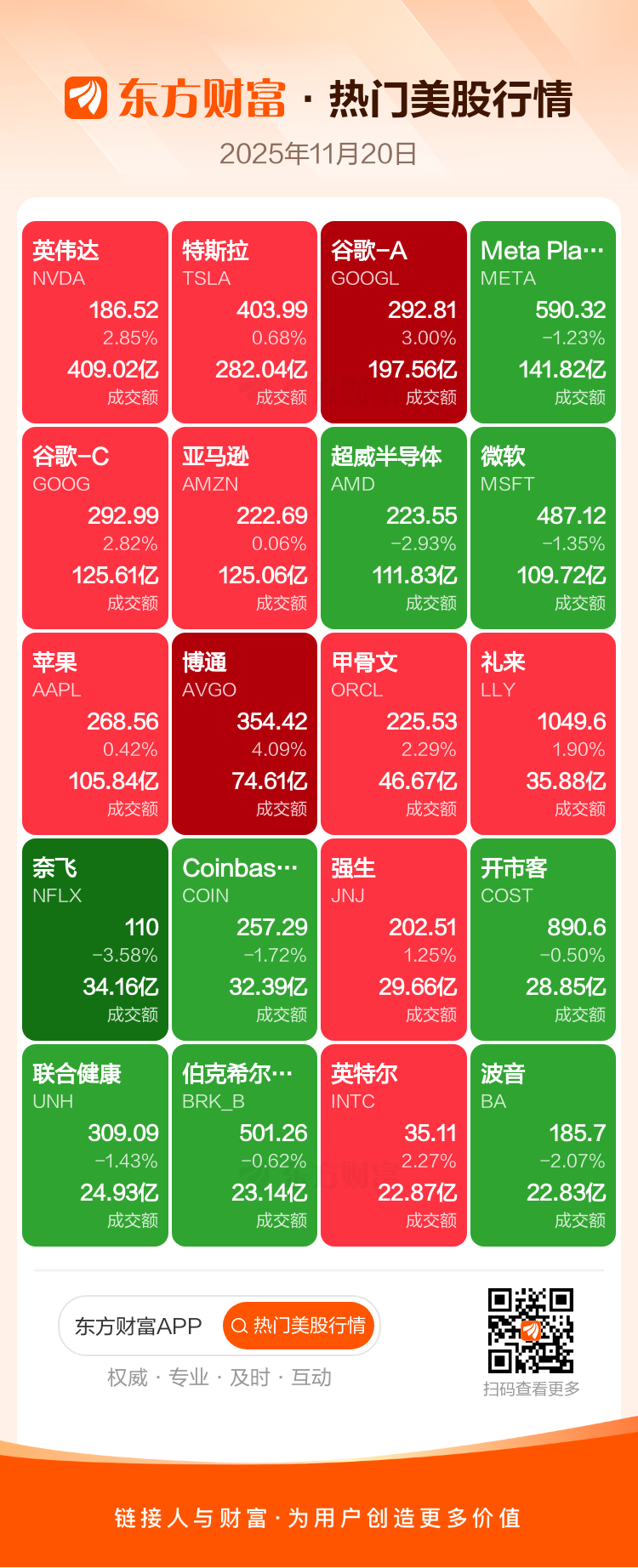 英伟达涨2.85%,特斯拉涨0.68%,谷歌-A涨3.00%,Meta Platforms Inc-A跌1.23%,谷歌-C涨2.82%,亚马逊涨0.06%,超威半导体跌2.93%,微软跌1.35%,苹果涨0.42%,博通涨4.09%。
