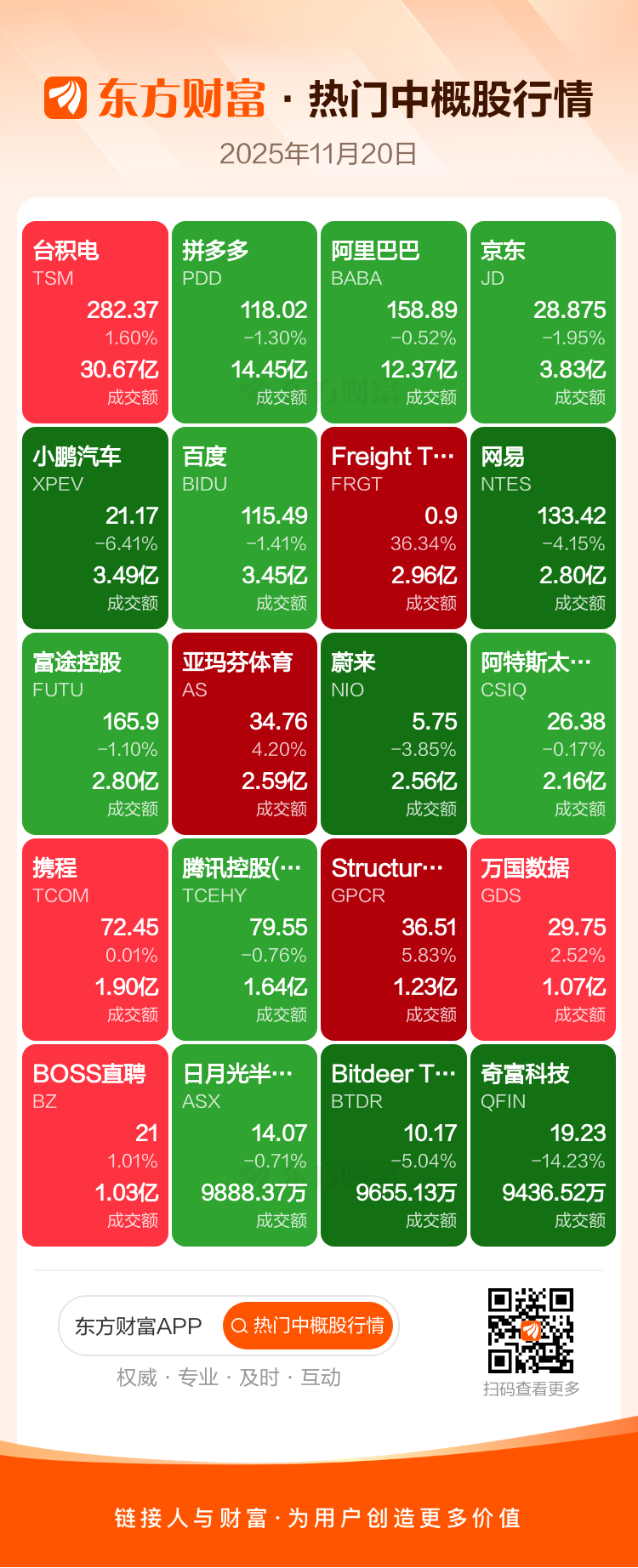 台积电涨1.60%,拼多多跌1.30%,阿里巴巴跌0.52%,京东跌1.95%,小鹏汽车跌6.41%,百度跌1.41%,Freight Technologies Inc涨36.34%,网易跌4.15%,富途控股跌1.10%,亚玛芬体育涨4.20%。