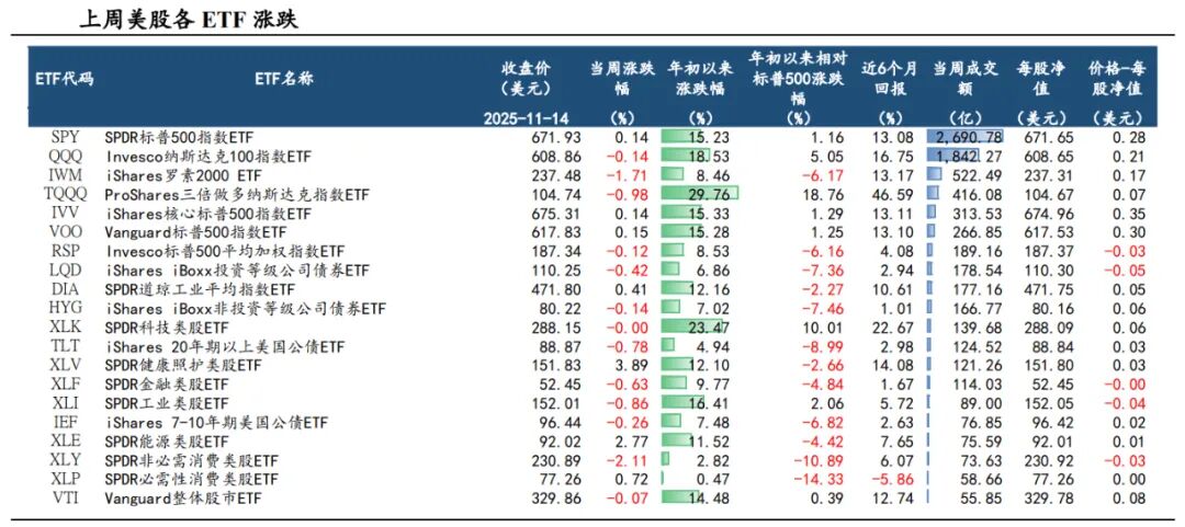 上周恒指、国指、恒生科技分别上涨1.26%、1.41%和下跌0.42%,整体先扬后抑震荡格局不改。与亚太市场相似,港股市场仍受到美联储降息预期降温和流动性紧张的影响,虽然关门结束有望缓解流动性紧张,但降息节奏不清晰或持续扰动市场。从联邦基金利率期货观察市场对12月降息预期已落在暂停降息区间,后续走势更多取决于就业数据,若就业数据好于预期外围市场恐慌情绪有望缓解,但市场风险偏好的回归可能更多在于美联储何时转鸽,在此之前仍需警惕外部流动性扰动,但基本面出现更多积极信号有望支撑市场明年预期维持在高位。