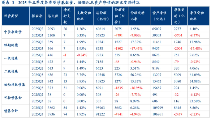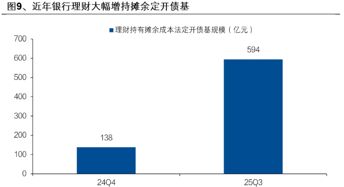 随着资本新规的落实,理财产品经历多轮赎回潮后对产品净值稳定关注度显著提升,但同时利率震荡下行使得理财也在寻求更高收益资产,因此净值稳定、收益相对确定的摊余定开债基成为较好的选择,逐步增加了对此类产品的配置。据我们不完全统计,24年末银行理财重仓摊余定开债基规模约138亿元,但是到了2025年三季度重仓规模高达594亿元,这也推动了今年开放的摊余定开债基主要持仓券种从政金债切换到了信用债。