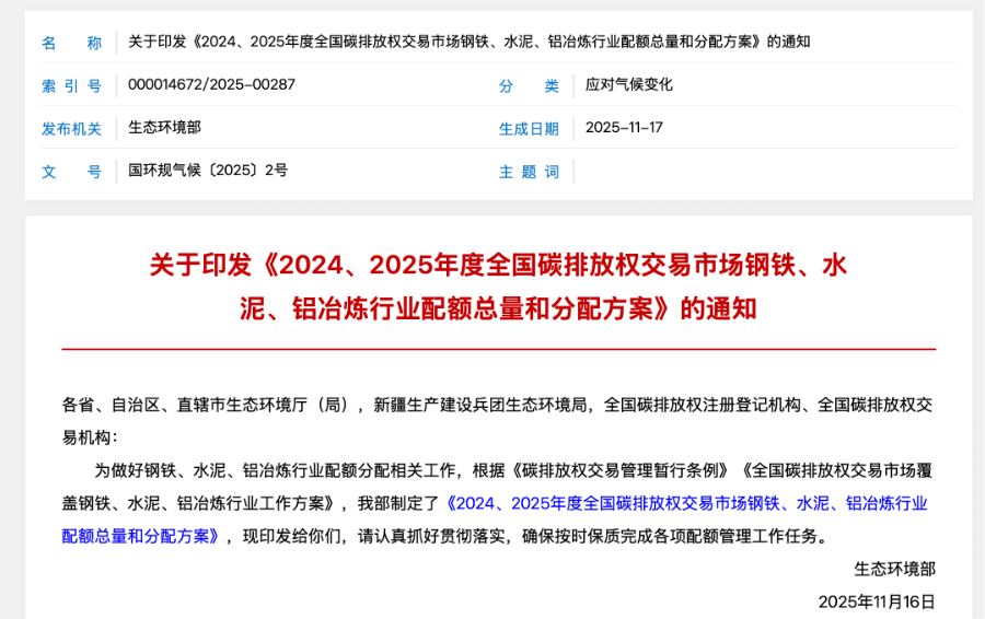 “到2027年,碳排放权交易市场基本覆盖工业领域主要排放行业。”近日,生态环境部发布《2024、2025年度全国碳排放权交易市场钢铁、水泥、铝冶炼行业配额总量和分配方案》(以下简称《配额方案》),明确三大行业碳配额分配方式和适用范围等内容,重申了碳市场扩围“路线图”。