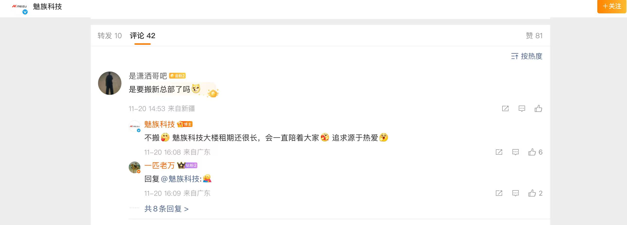 同日下午,有网友在@魅族科技的官方微博账号评论区中留言询问:“是要搬新总部了吗?”对此,魅族科技回应称:“不搬,魅族科技大楼租期还很长,会一直陪着大家,追求源于热爱。”