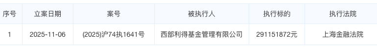 近日,西部利得基金被上海金融法院列为被执行人,立案时间为11月6日,执行金额高达2.91亿元。