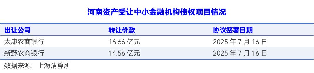 河南资产管理有限公司(以下简称河南资产)是河南省另一地方AMC。今年以来,河南资产也参与了省内中小金融机构的风险化解。例如,河南资产通过公开竞价形式参与省内太康农商银行、新野农商银行的不良资产转让,并于今年7月16日签订不良资产收购协议。公司向两家银行支付的资产包收购价款分别为16.66亿元、14.56亿元。