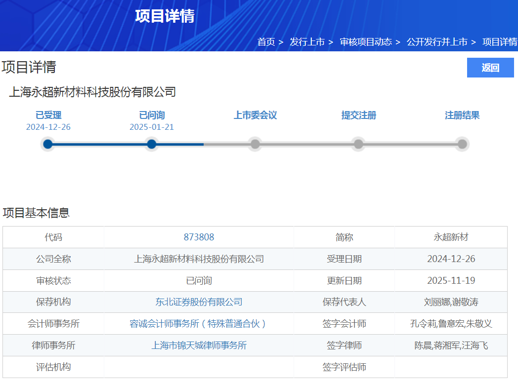 11月19日,上海永超新材料科技股份有限公司(以下简称“永超新材”)在北交所更新上市申请审核动态,公司已收到第二轮审核问询函,控制权稳定性、毛利率异常、收入真实性、业绩持续性、募投项目必要性等问题引发监管关注。