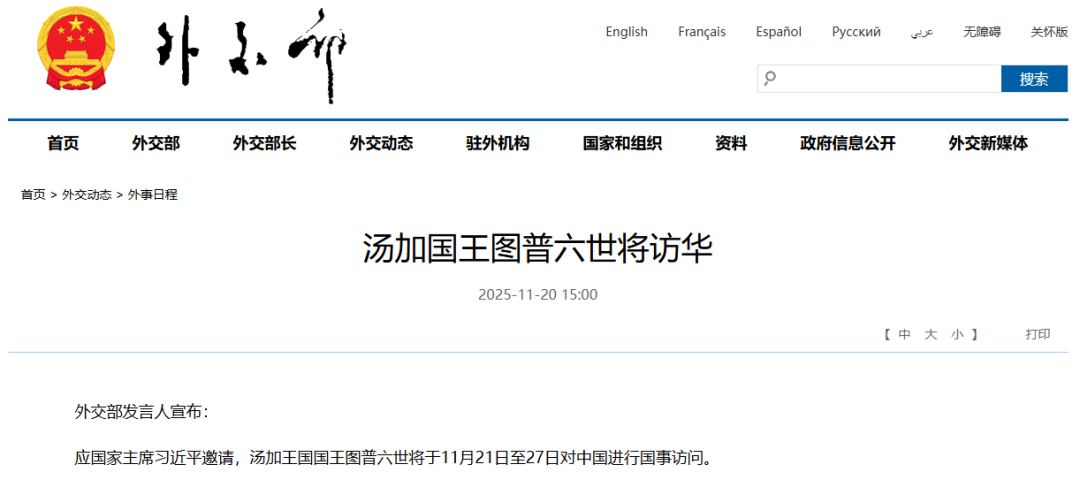 应国家主席习近平邀请,汤加王国国王图普六世将于11月21日至27日对中国进行国事访问。
