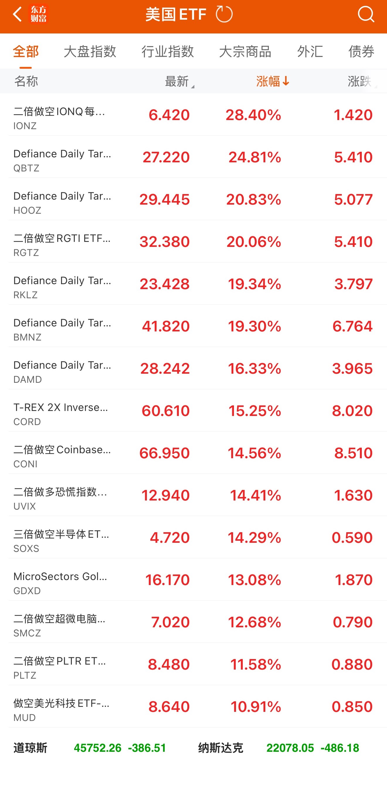 美股ETF升幅榜Top52倍做空IONQ ETF-Defiance(IONZ.US) 升28.40%,成交额1.91亿美元。