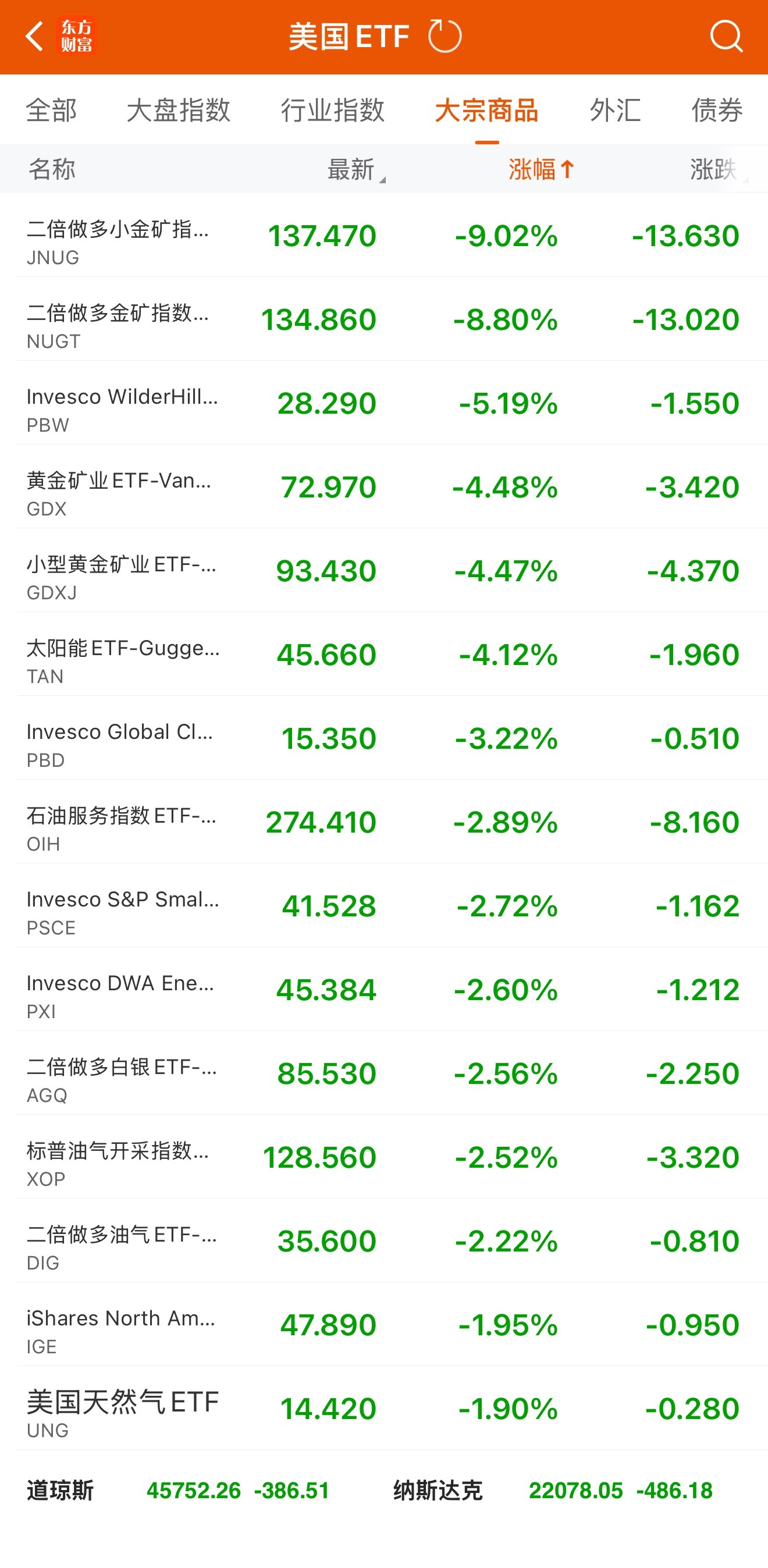2倍做多金矿指数ETF-Direxion(NUGT.US) 跌8.80%,成交额1.58亿美元。