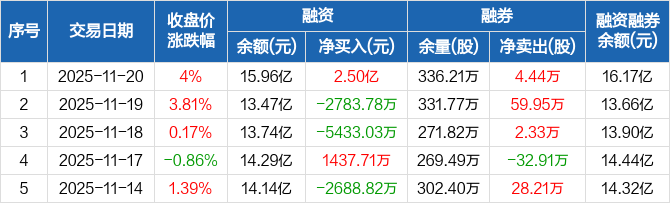 融资方面,当日融资买入7.89亿元,融资偿还5.39亿元,融资净买入2.5亿元,净买入额创12个月新高。融券方面,融券卖出25.65万股,融券偿还21.21万股,融券余量336.21万股,融券余额2097.95万元。融资融券余额合计16.17亿元。