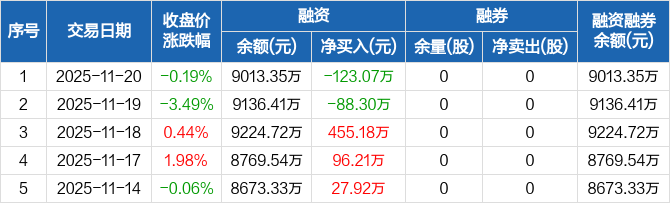 九州一轨:融资净偿还123.07万元,融资余额9013.35万元(11-20)