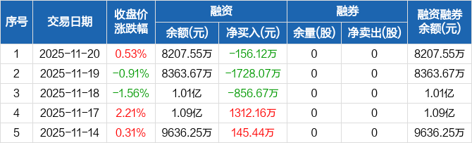 融资方面,当日融资买入938.26万元,融资偿还1094.38万元,融资净偿还156.12万元,连续3日净偿还累计2740.86万元。融券方面,融券卖出0股,融券偿还0股,融券余量0股,融券余额0元。融资融券余额合计8207.55万元。
