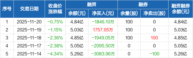 融资方面,当日融资买入5478.17万元,融资偿还7324.27万元,融资净偿还1846.1万元。融券方面,融券卖出0股,融券偿还0股,融券余量100股,融券余额2637元。融资融券余额合计4.84亿元。