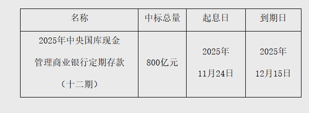 央行官网消息,财政部、中国人民银行于2025年11月24日以利率招标、多重价位中标方式进行了2025年中央国库现金管理商业银行定期存款(十二期)招投标,中标总量800亿元。