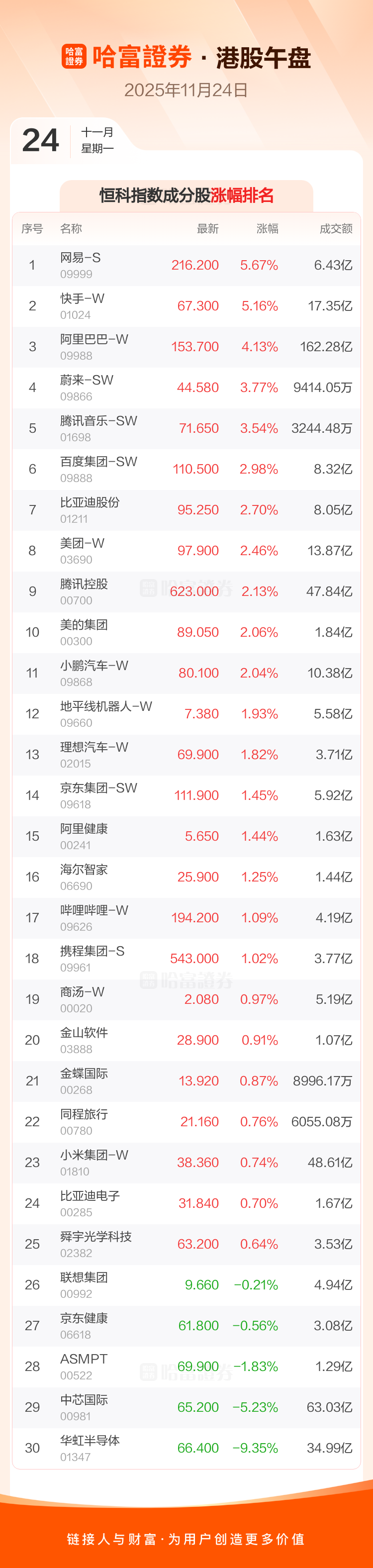 港股11月24日午盘走高,恒生指数收报25578.88点,涨358.86点,涨幅1.42%;恒生科技指数收报5484.46点,涨88.97点,涨幅1.65%。恒生指数成分股中网易-S、快手-W、阿里巴巴-W涨幅居前,中芯国际、信义光能、信义玻璃跌幅靠前。恒生科技指数成分股中网易-S、快手-W、阿里巴巴-W涨幅居前,华虹半导体、中芯国际、ASMPT跌幅靠前。