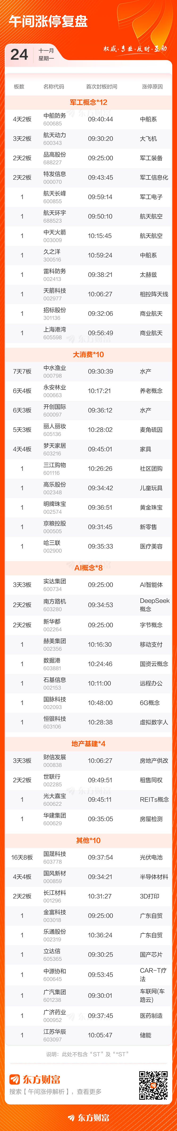 11月24日午间涨停复盘:54股涨停 中船防务4天2板