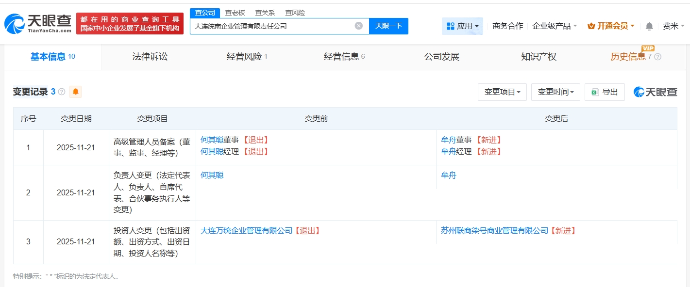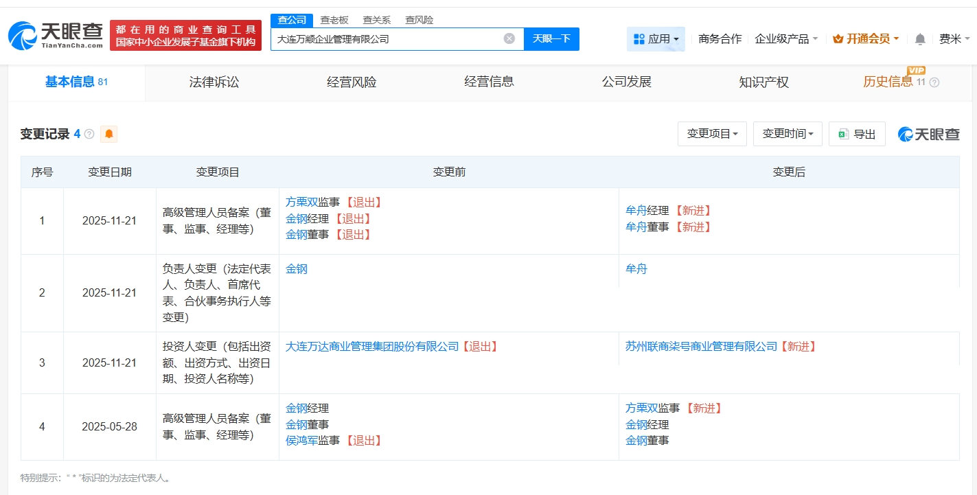 天眼查工商信息显示,近日,大连万颛企业管理有限公司发生工商变更,原股东大连万达商业管理集团股份有限公司退出,新增浙金信托旗下苏州联商柒号商业管理有限公司为全资股东,同时发生法定代表人、主要人员变更。此外,苏州联商柒号商业管理有限公司还接手了大连万达商业管理集团股份有限公司旗下的大连统南企业管理有限责任公司。大连万颛企业管理有限公司、大连统南企业管理有限责任公司分别成立于今年1月、今年3月,法定代表人均为牟舟,注册资本均为1000万元人民币,经营范围为企业总部管理、企业管理咨询、以自有资金从事投资活动。