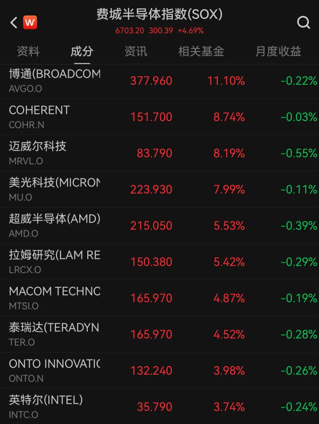 芯片股多数走强。Wind数据显示,费城半导体指数上涨4.69%,博通涨超11%,美光科技涨近8%,AMD涨超5%,英伟达涨超2%。