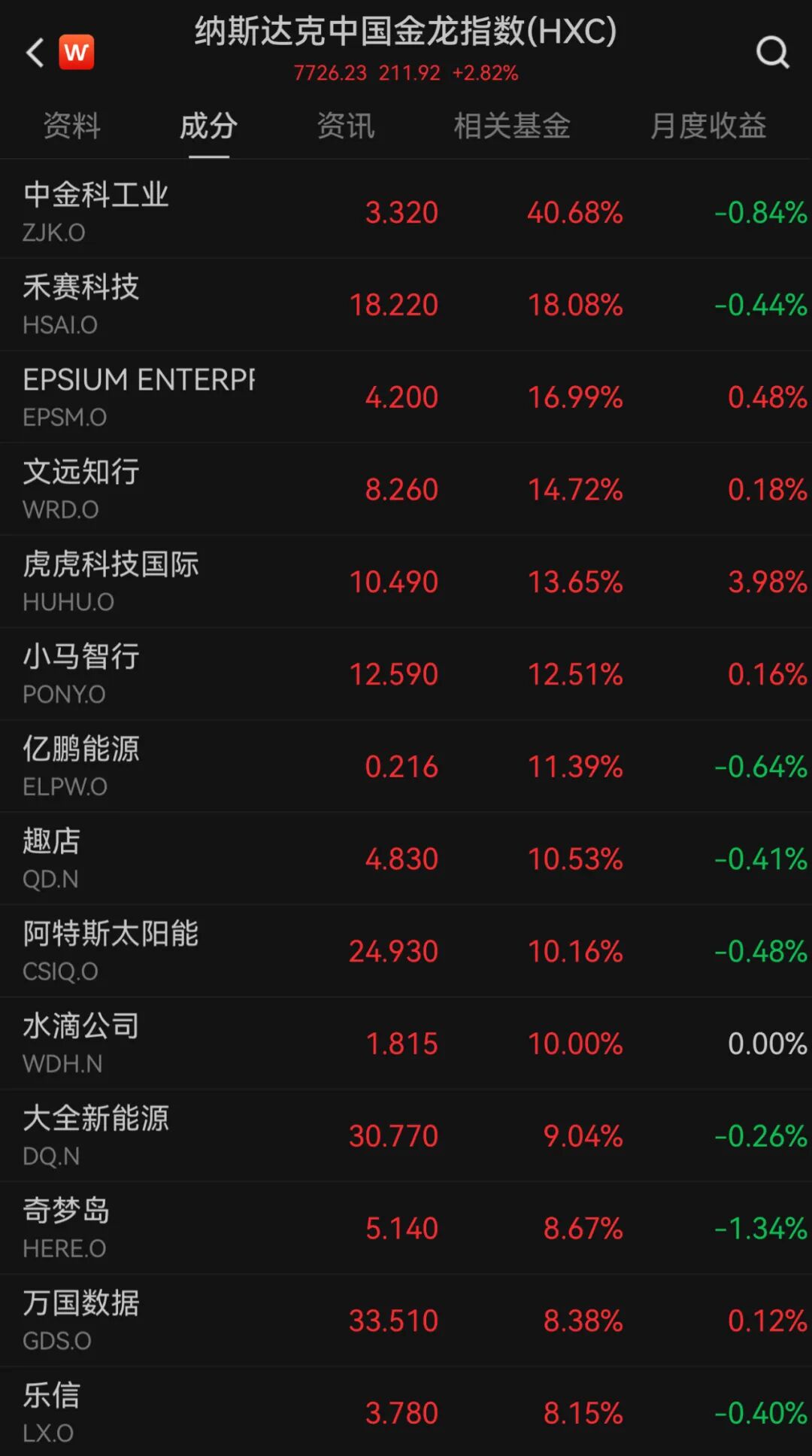 中国资产多数上涨。Wind数据显示,纳斯达克中国金龙指数上涨2.82%。其中,中金科工业大涨40.68%,禾赛科技大涨18.08%,大全新能源涨超9%。