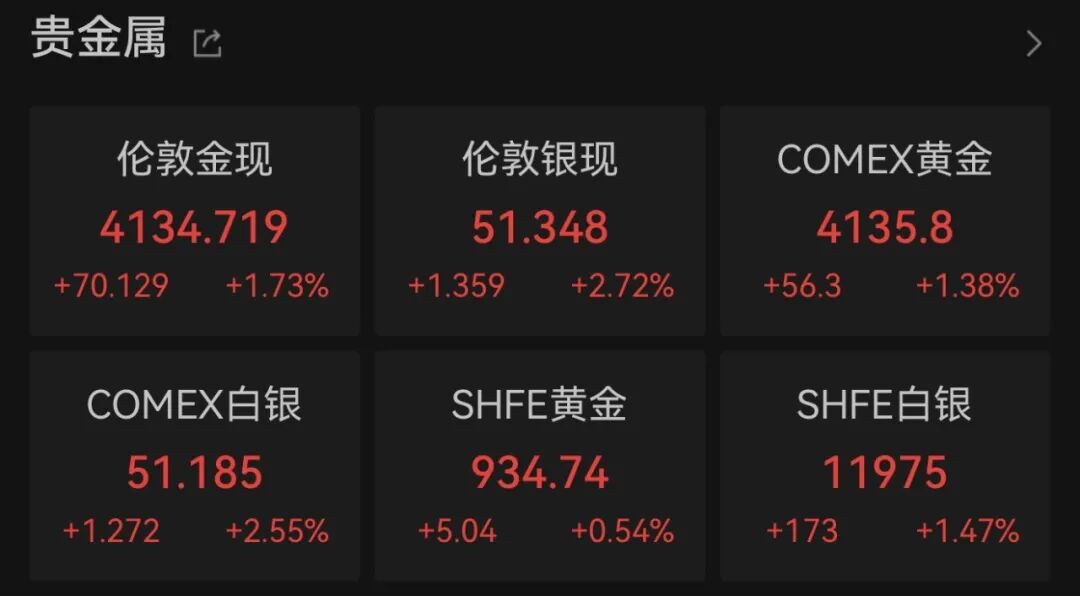 贵金属方面,Wind数据显示,截至北京时间11月25日5时59分,现货黄金价格上涨1.73%;COMEX黄金期货上涨1.38%。