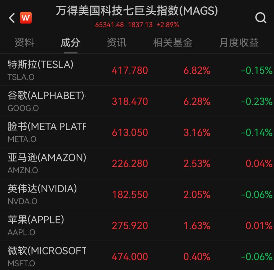 美股科技“七巨头”全部上涨。Wind数据显示,截至收盘,万得美国科技七巨头指数上涨2.89%。